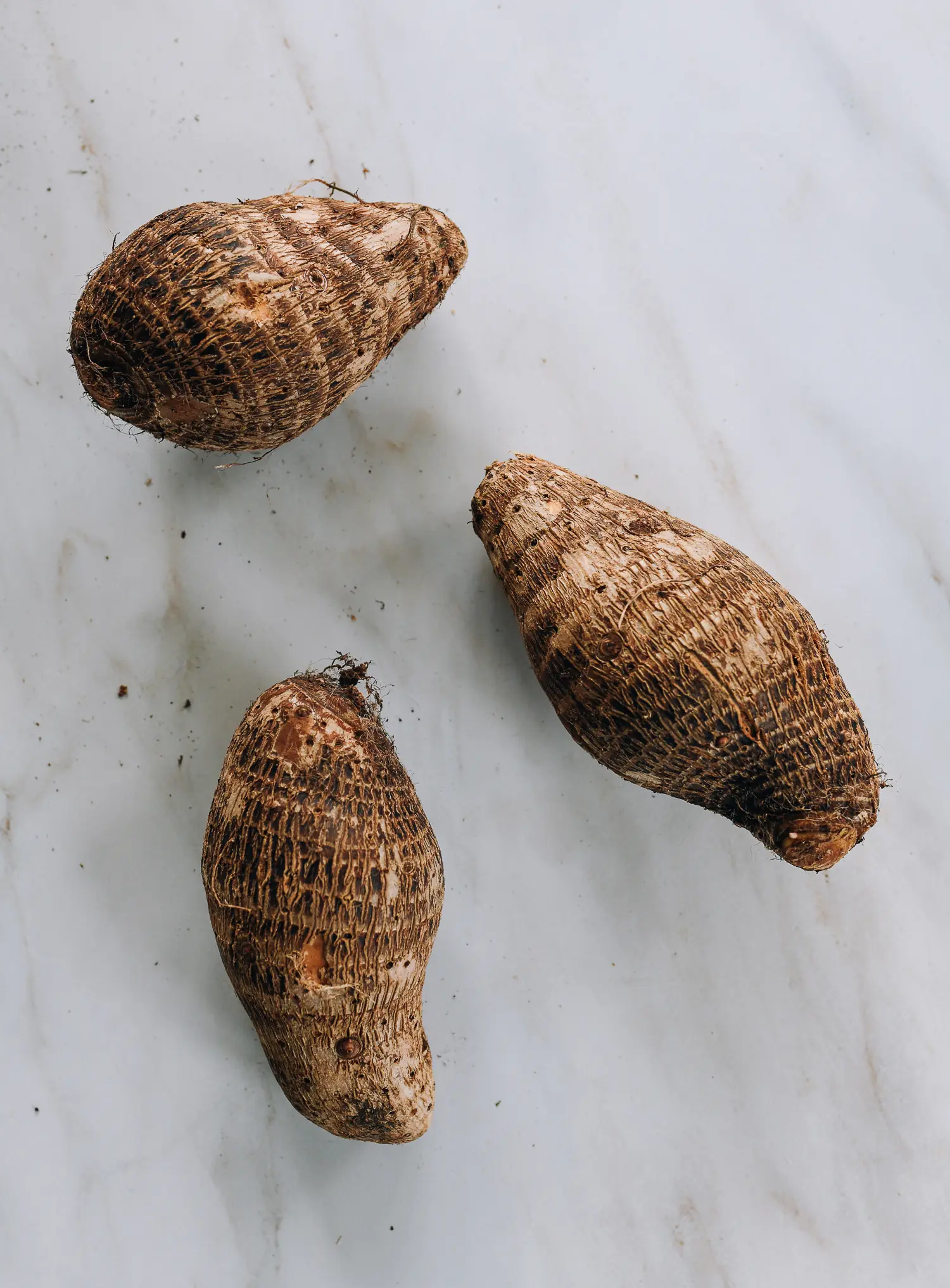 Taro root is a starchy root vegetable originally cultivated in Asia and now enjoyed worldwide. It has brown skin and white flesh with purple specks. When cooked, it has a mildly sweet taste and a texture similar to potatoes.