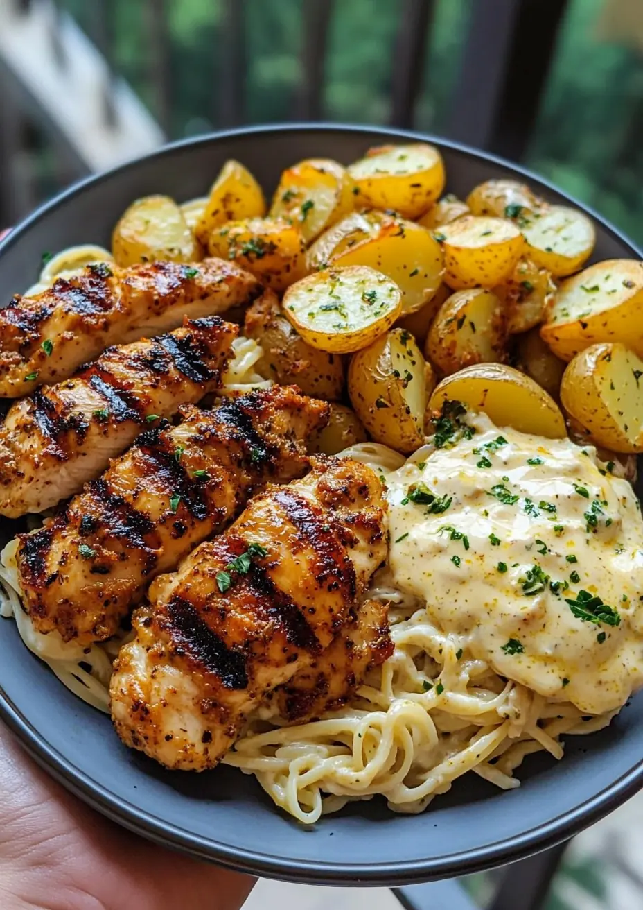 5. Assemble the Plate • Serve lemon-garlic Alfredo pasta topped with crispy Greek chicken. • Add roasted garlic-herb potatoes alongside. • Drizzle generously with hot honey pesto cream. • Garnish with fresh parsley and extra Parmesan cheese.