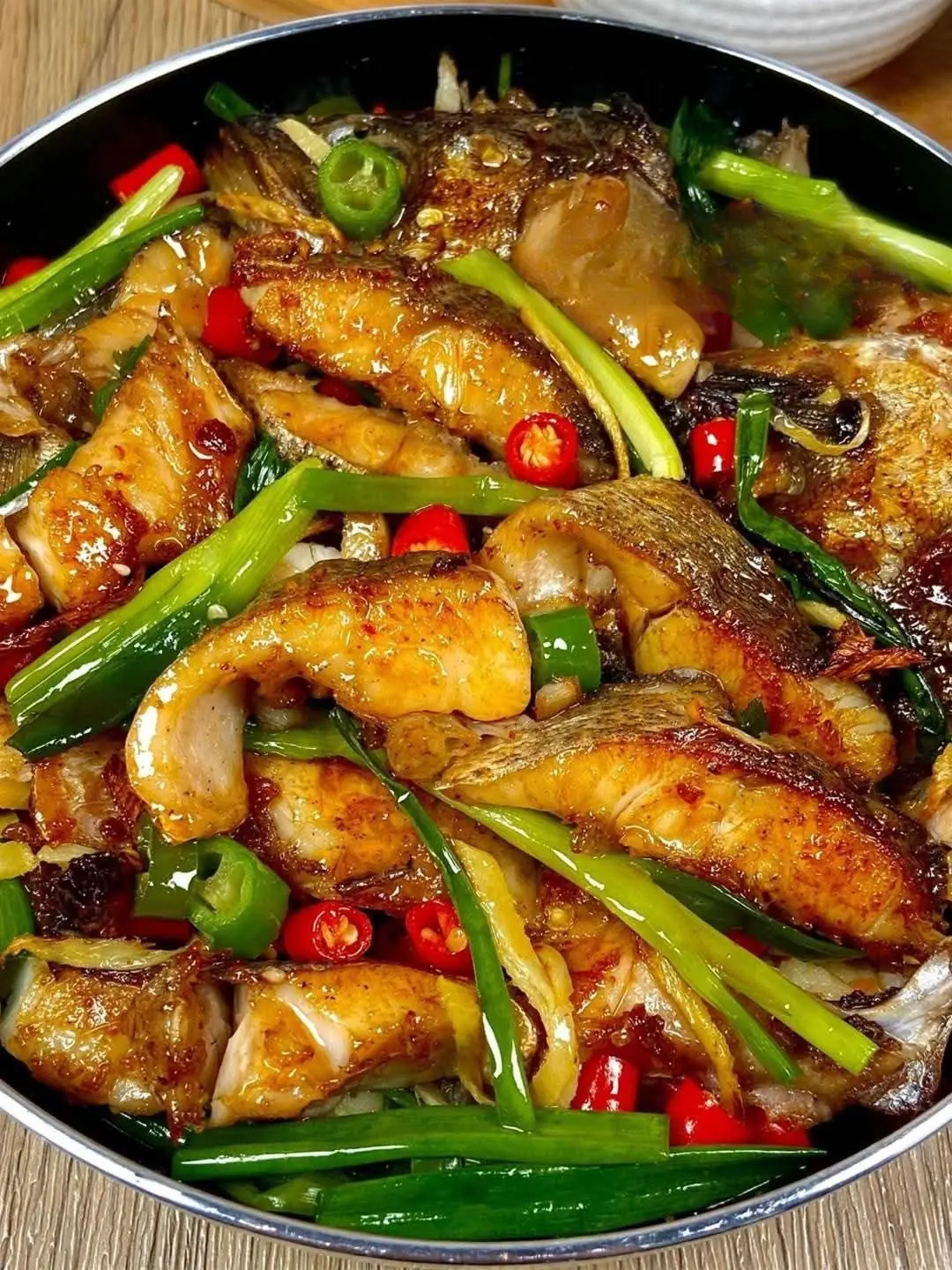 A delicious and aromatic dish featuring crispy pan-fried fish fillets with a savory, slightly sweet scallion sauce. This dish pairs perfectly with steamed rice for a satisfying meal.
