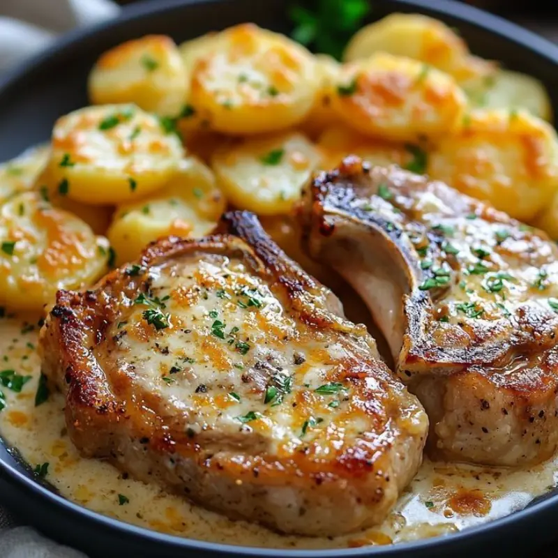 A rich garlic butter pork chop dish with creamy, comforting potatoes.