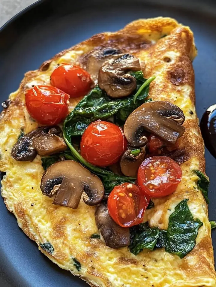 A hearty and nutritious omelette packed with rich flavors! Ingredients: 2 eggs ½ tbsp butter or olive oil ¼ cup cherry tomatoes, halved ¼ cup mushrooms, sliced ¼ cup fresh spinach Salt & black pepper (to taste) ¼ tsp garlic powder (optional) 1 tbsp cheese (optional) Step by Step: Sauté the Vegetables: Heat a pan over medium heat and add butter or olive oil. Add mushrooms and cook for 3-4 minutes until browned. Add cherry tomatoes and spinach, cooking until softened. Cook the Omelette: In a bowl, whisk the eggs with salt, black pepper, and garlic powder. Pour the eggs over the vegetables in the pan. Let cook for 2-3 minutes until the edges set. Fold & Serve: If using cheese, sprinkle it on one side of the omelette. Fold the omelette in half and cook for another minute. Serve hot with a side of sauce or chutney. Prep Time: 5 minutes | Cook Time: 10 minutes | Total Time: 15 minutes Calories: ~250 per serving | Protein: ~15g per serving