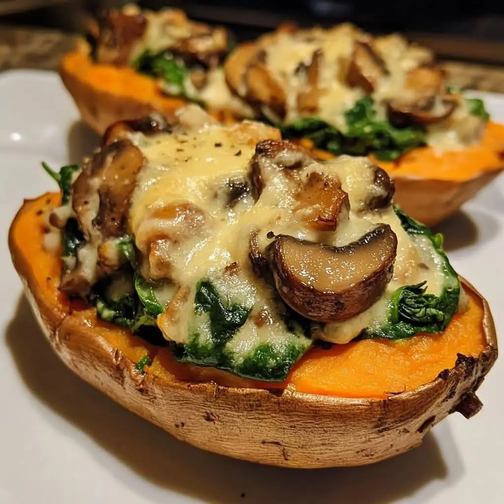 Ingredients: - 4 medium sweet potatoes - 2 cups fresh spinach - 1 cup mushrooms, chopped - 1 cup cream cheese, softened - 1/2 cup grated cheese (like Parmesan or cheddar) - 1/4 cup milk - 2 cloves garlic, minced - Salt and pepper to taste - Olive oil for cooking
